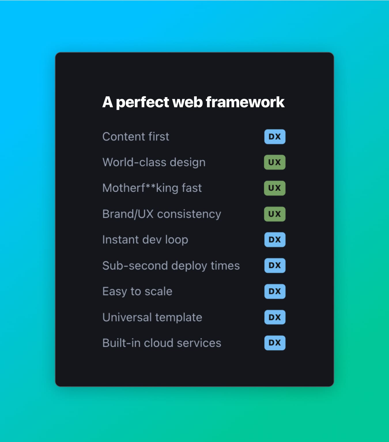 A perfect framework should show a live preview of your change after you save a file. Be it content, styling, layout, server component, or client-side reactive component — you should see the change immediately. And if you make a mistake, the framework will tell you exactly what went wrong.