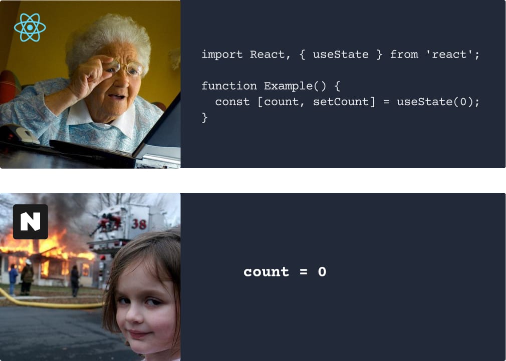 . Here's how the difference between React and Nue using an identical counter component: